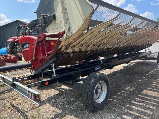 Barre de coupe CASE IH 2050 - de 2011 - 7.32 mètres de largeur de travail - équipement tournesol JOSEPH LACOMBE - chariot de coupe COCHET 4WD