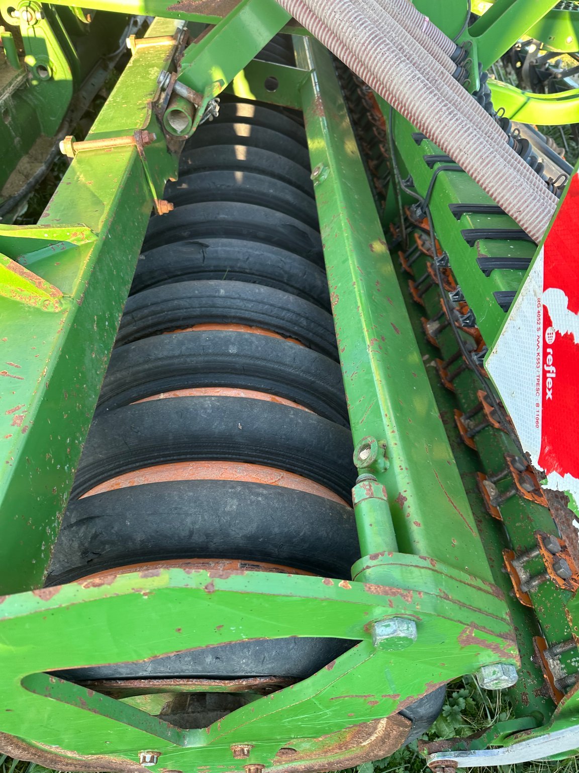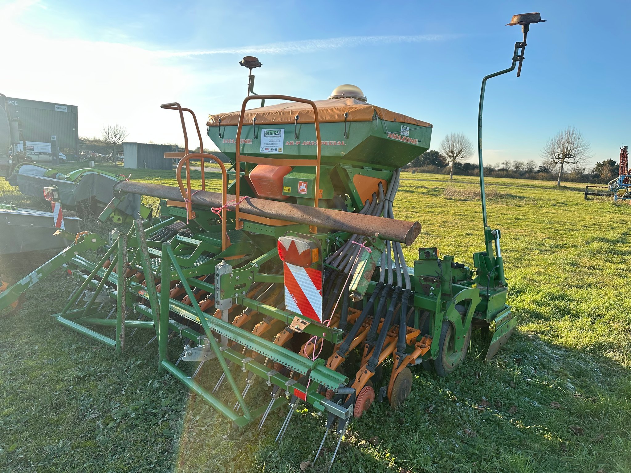 Combiné de semis AMAZONE AD-P 402 + CULTIMIX KG 4000 SPECIAL - de 2012 - 4 mètres de largeur de travail - éléments semeurs à disques type rotec - 2 rangées - passerelle d'accès - herse flexidoigts - traceurs latéraux - démontage rapide des dents - rouleaux matrix - barre niveleuse - déflecteurs latéraux escamotables - boîtier en cabine - signalisation